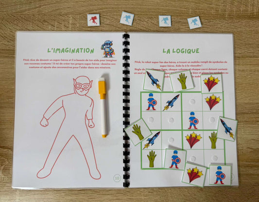 Imaginez votre enfant captivé, souriant et fier de relever des défis aux côtés de Pitok, un robot curieux qui guide chaque aventure. ✨ Nos cahiers éducatifs Club Ludique, conçus avec soin par une psychomotricienne 👩⚕️, offrent des pages plastifiées réutilisables ✍️ et un feutre effaçable 🖍️. Une expérience ludique et durable, où chaque mission devient un moment d’apprentissage inoubliable.